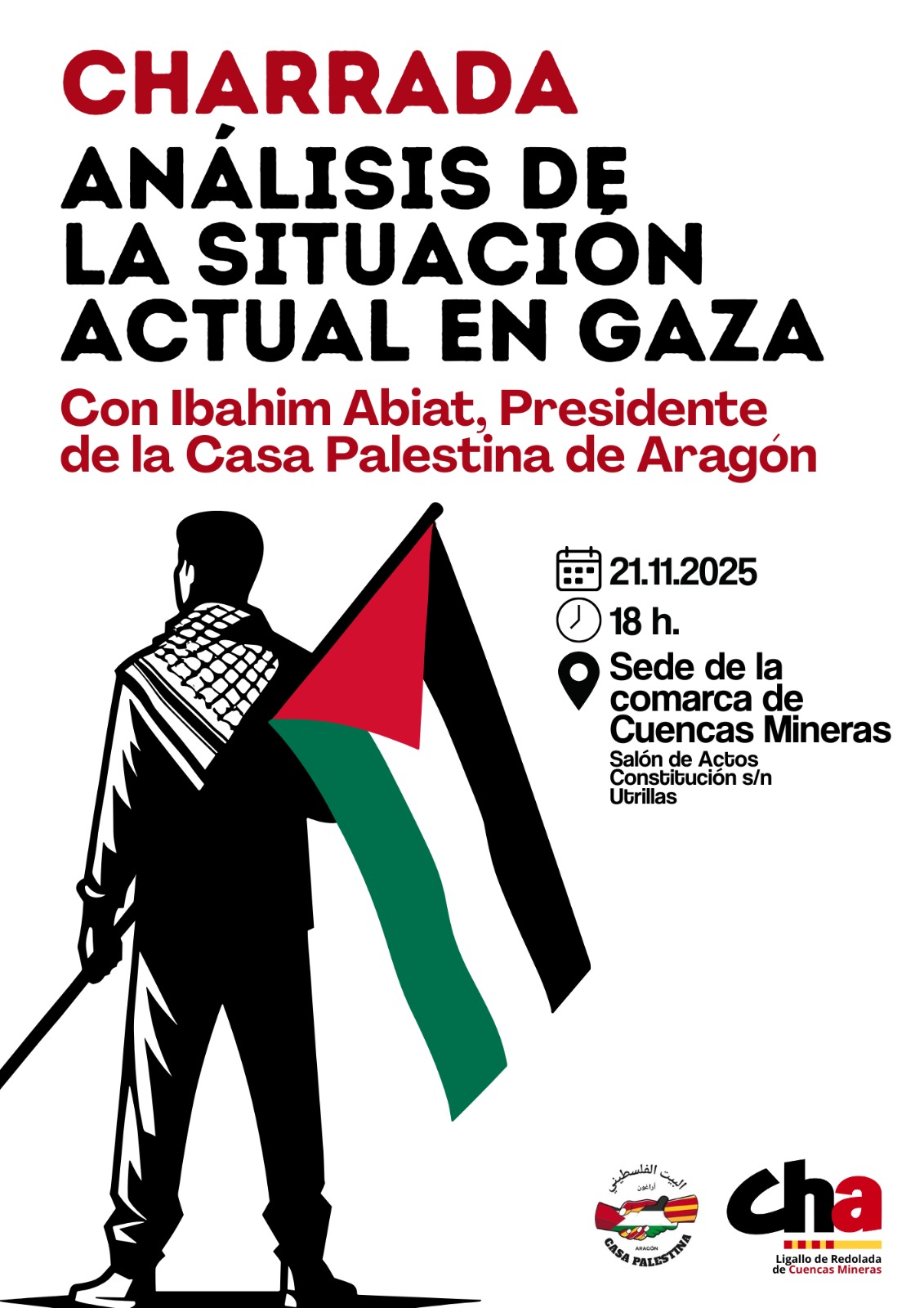 Charrada "Análisis de la situación actual en Gaza" con Ibrahim Abiat, Presidente de la Casa Palestina de Aragón. Viernes 21 de Noviembre, 18:00 h. Sede de la comarca de las Cuencas Mineras, Salón de Actos, Constitución s/n, Utrillas. |