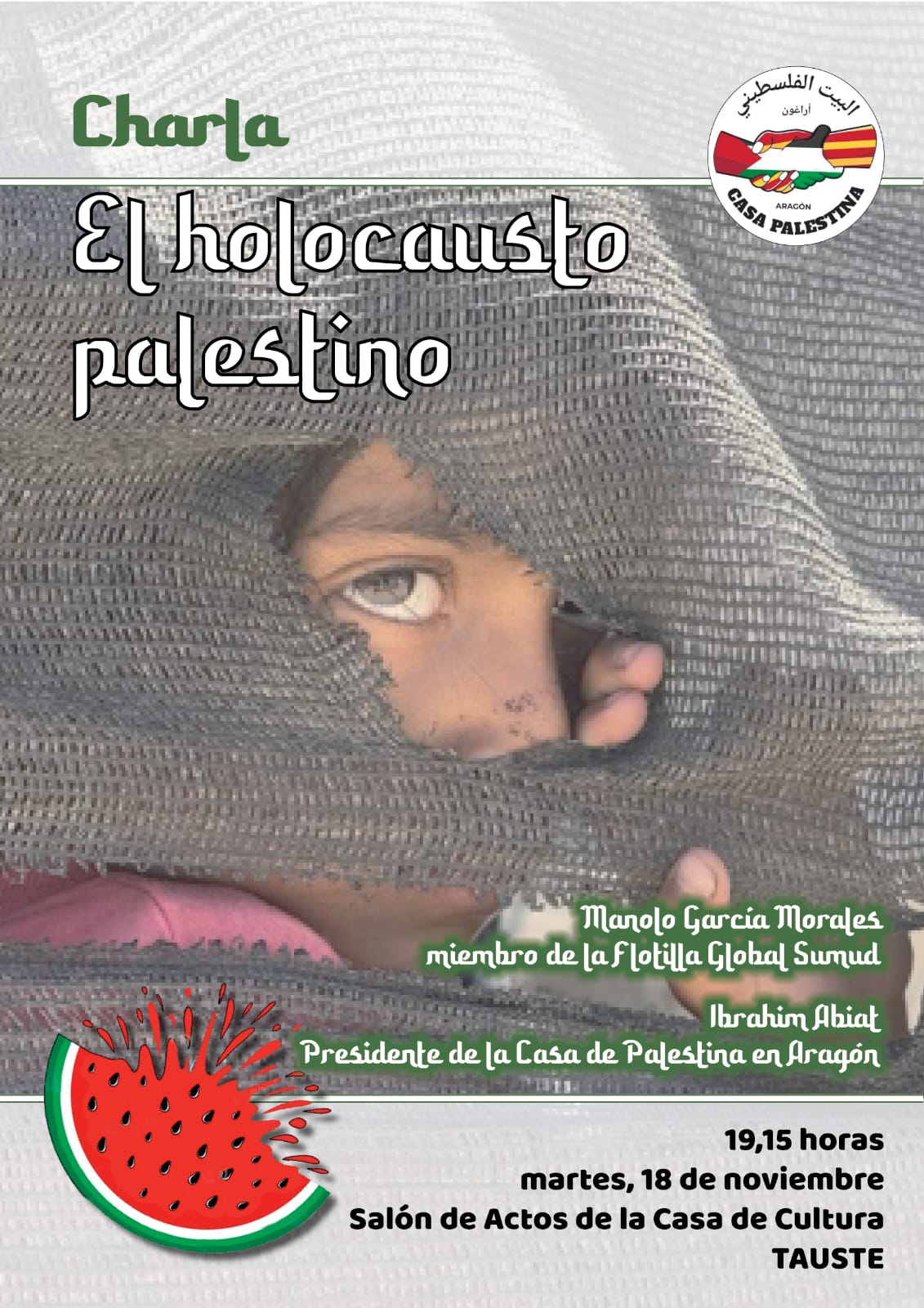 Charla "El holocausto Palestino" con Manolo García Morales, miembro de la Flotilla Global Sumud e Ibrahim Abiat, Presidente de la Casa Palestina de Aragón. Martes 18 de Noviembre, 19:15 h. Salón de Actos de la Casa de Cultura de Tauste. Plaza de Aragon, 50660 Tauste, Zaragoza |