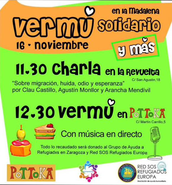 Vermú Solidario en la Madalena - Domingo 16 de Noviembre 11:30 h. - Charla en La Revuelta (C/ San Agustín, 18) 12:30 h. - Vermú en Pottoka con música en directo* (C/ Martín Carrillo, 5) * Todo lo recaudado será donado al Grupo de Ayuda a Refugiadxs en Zaragoza y Red SOS Refugiados Europa |